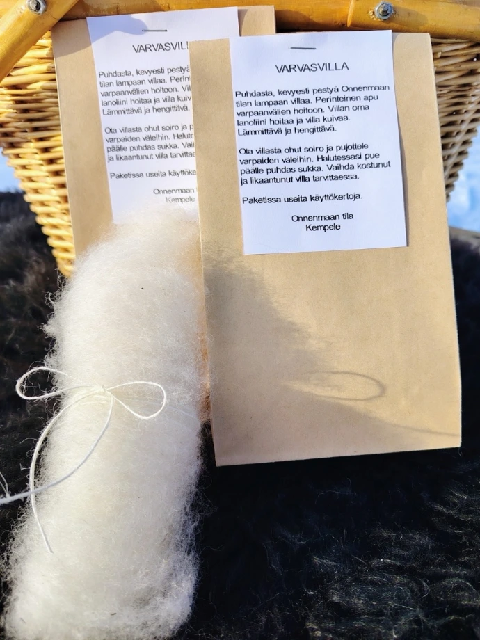 Kevyesti pestyä, luontaista lanoliinia sisältävää Onnenmaan lampaiden villasta työstettyä varvasvillaa. Perinteinen apu varpaanvälien hoitoon. Pussissa useita käyttökertoja, noin 10g/pussi. Hinta 4€ sis. alv. 25,5%.